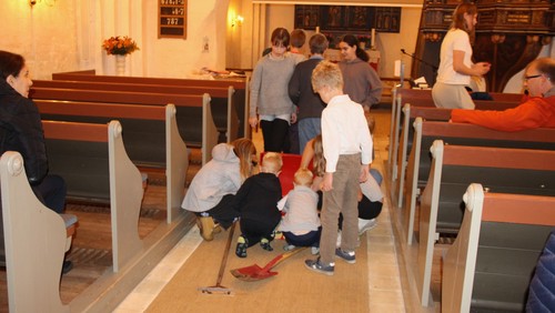 Til denne aftens Messy Church hørte vi lignelsen om skatten og om perlen. Der blev fundet en skat både i kirken og på et løb i præstegården. Der kunne også findes perler i "tang" og laves østerskiks med en perle i.